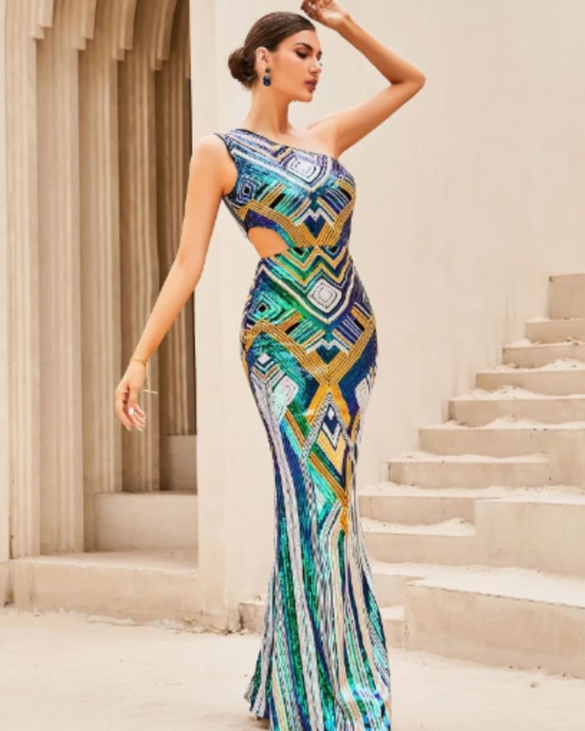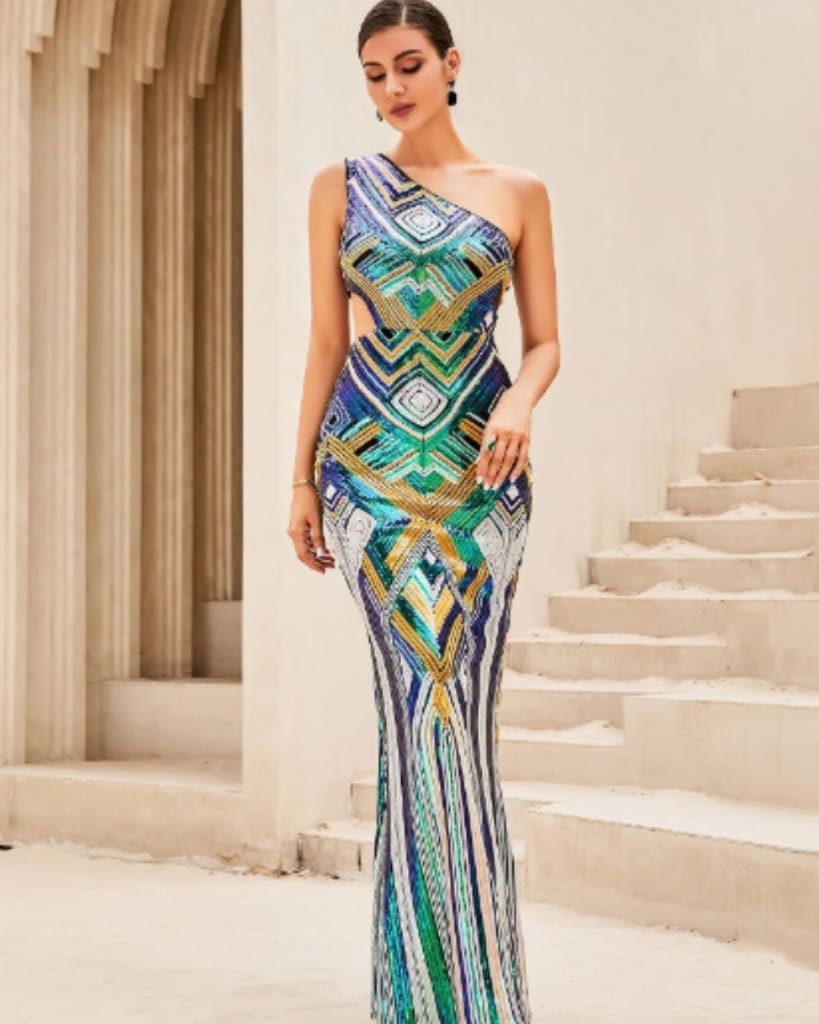 Be the belle of the ball with this gorgeous Allover Print One Shoulder Sequin Gown Dress! Featuring a beautiful allover design and one shoulder sequin detailing, this dress is perfect for any formal evening occasion. Channel your inner goddess and let your style shine!