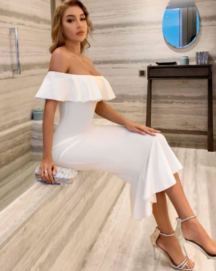 This is your time to shine with this elegant strapless ruched bodycon white mermaid midi dress perfect for any occasion. It offers unrivalled versatility and sheer elegance.