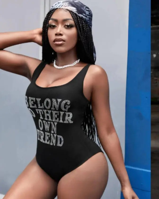 Step out in style with our letter sleeveless black bodysuit.