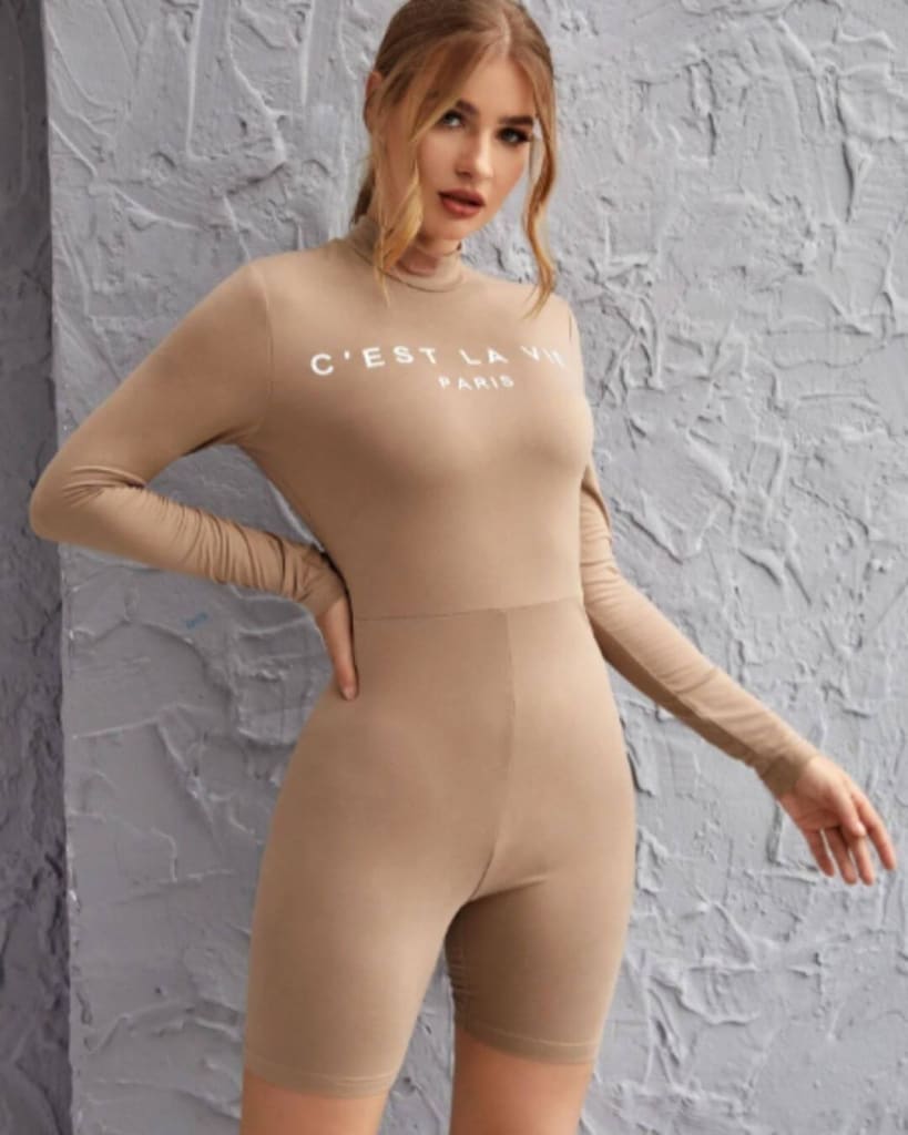 If you’re ready to take on the world and showcase your unique jumpsuit, our letter print long sleeve khaki romper has you covered. It is stretchy and elegant.