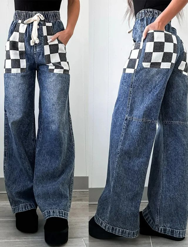Make a bold fashion statement with our Checkerboard Plaid Denim Jeans. Featuring a unique black-and-white checkerboard pattern fused with classic denim styling, these jeans redefine streetwear cool. The mid-rise fit and straight-leg cut offer both comfort and edge, perfect for creating standout looks.
