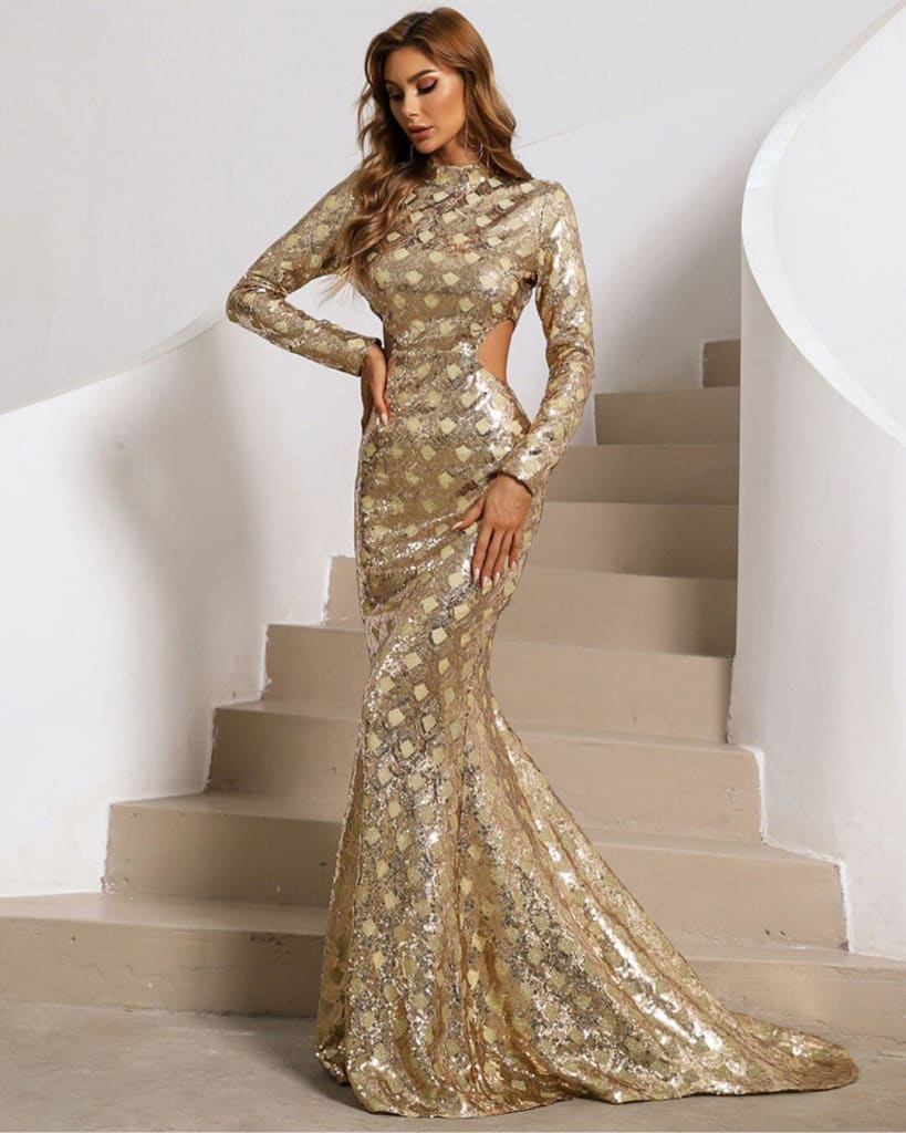 Wrap up in style for the season ahead with our on trend backless o-neck floor length sequin long sleeve maxi dress from STYLORD! Available for rent and/or sale.