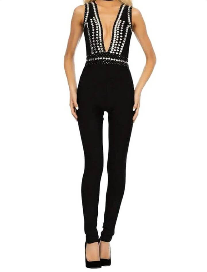 Get ready to take your style to the next level with our Deep V Beading Bandage Sleeveless Jumpsuit, and become the best dressed in the room.