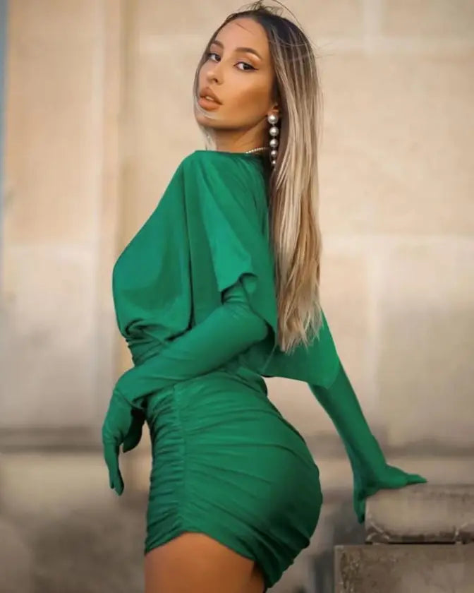This stunning Deep V Long Sleeve Ruched Mini Dress comes complete with gloves for a luxurious touch. The deep V neckline and ruched design accentuate your figure, while the long sleeves add elegance. Perfect for a night out, this dress will make you feel confident and alluring.