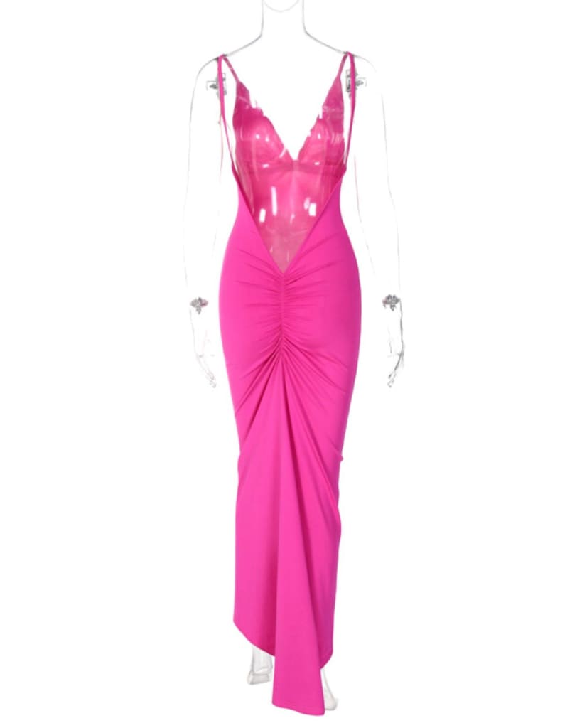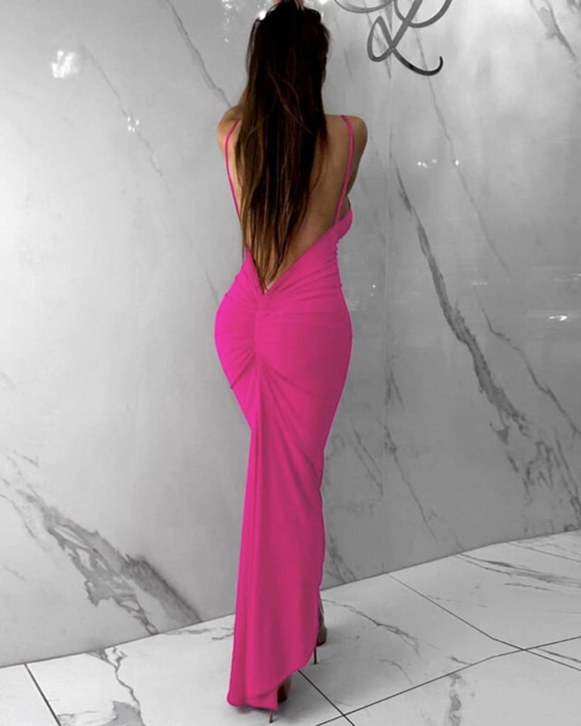 This solid deep v-neck maxi cocktail dress is perfect for special occasions. Featuring a ruched and backless design, it is both elegant and comfortable. Show off your style with the added slit in the skirt for an extra touch of glamour.