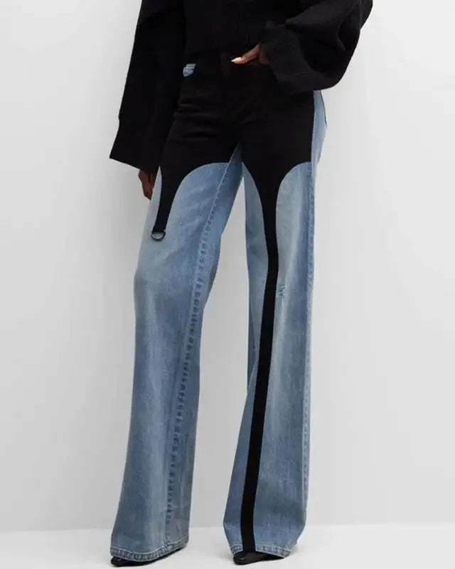 Denim High Waist Black And Blue Contrast Stitching Jeans
