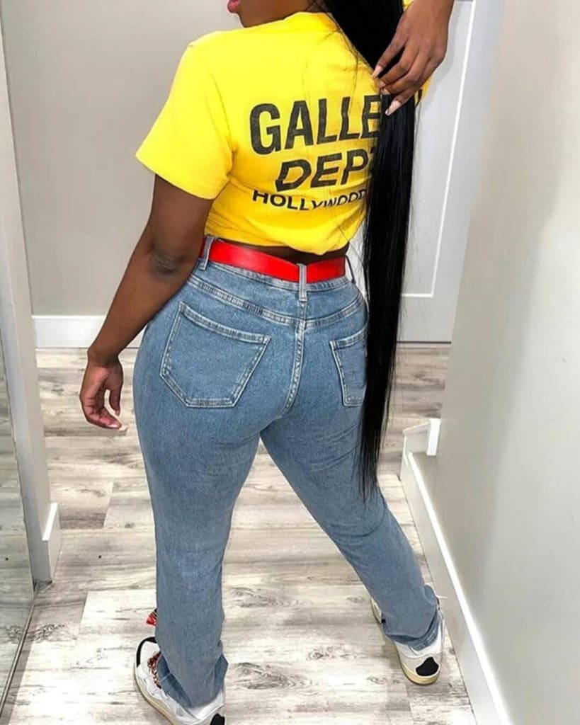 Shop the stylish denim high waist graphic print pocket jeans for a unique look!