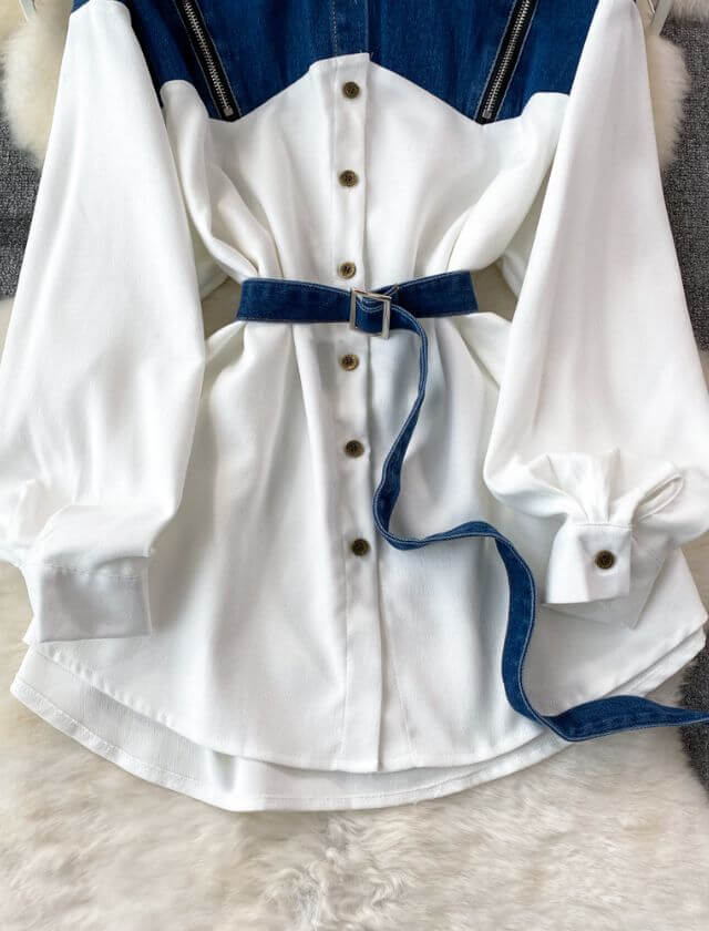 Step out in style with our Denim Spliced Long Sleeve Belt Shirt! This fashion-forward piece is a must-have for any trendsetter who loves to experiment with their style. Crafted with a combination of denim and spliced fabrics, this shirt exudes an effortlessly cool and casual vibe that’s perfect for both summer and winter.
