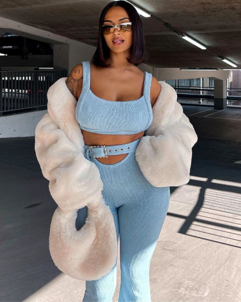 Look elegant and stylish in this contemporary two-piece set. Featuring a crop top with belt and a hollow out pant, this classic set is perfect for any occasion from parties to daytime events. Show off your curves with the bodycon fit of this sexy summer style.