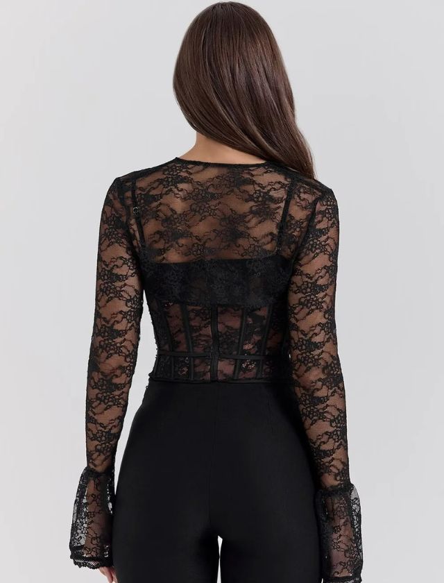 With a flattering V-neck and delicate lace detailing, this top exudes sophistication and glamour, turning heads wherever you go. The corset design accentuates your figure, giving you a flawless silhouette that will have everyone talking. The long sleeves make it perfect for both winter and summer, allowing you to be stylish and comfortable all year round.