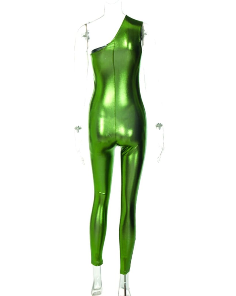 Make an unforgettable statement with this elegant one-shoulder jumpsuit. Crafted from soft Pu faux leather, its sleek silhouette exudes confidence and style. Dare to be bold and make a lasting impression!