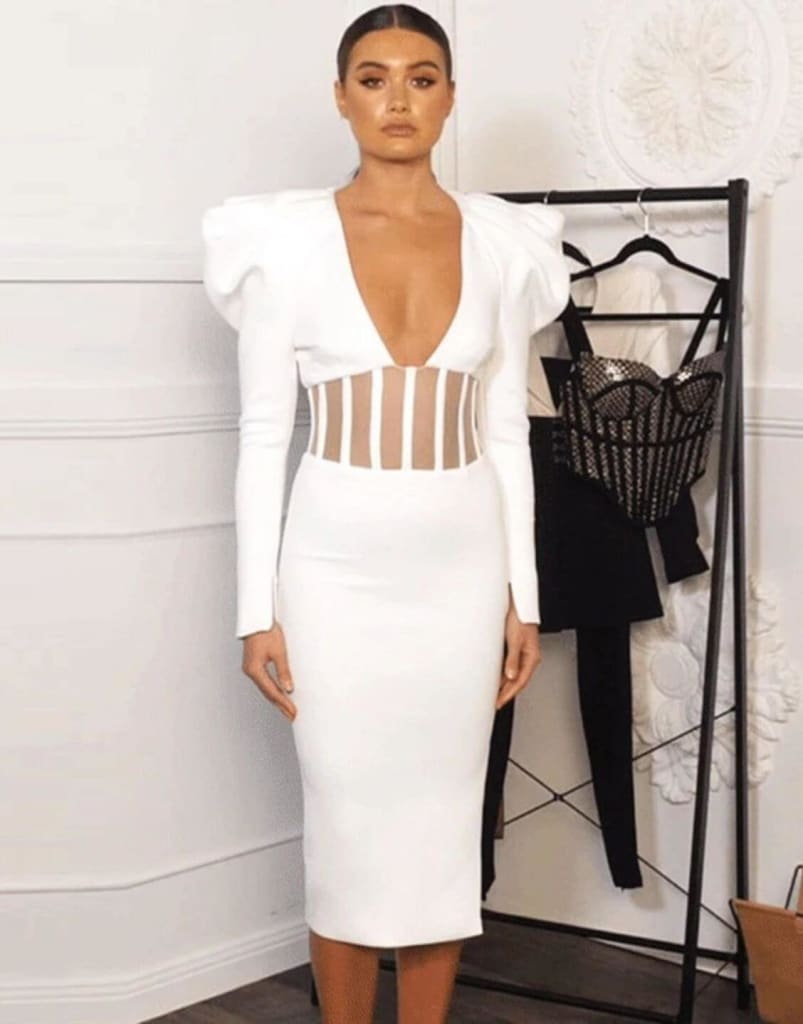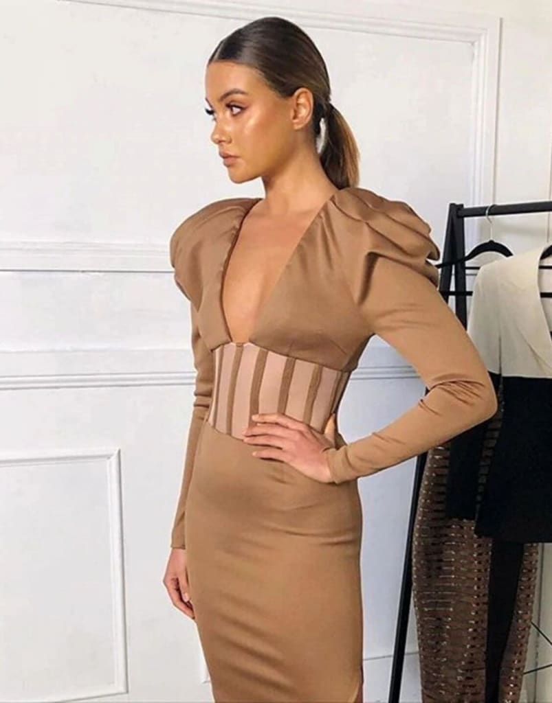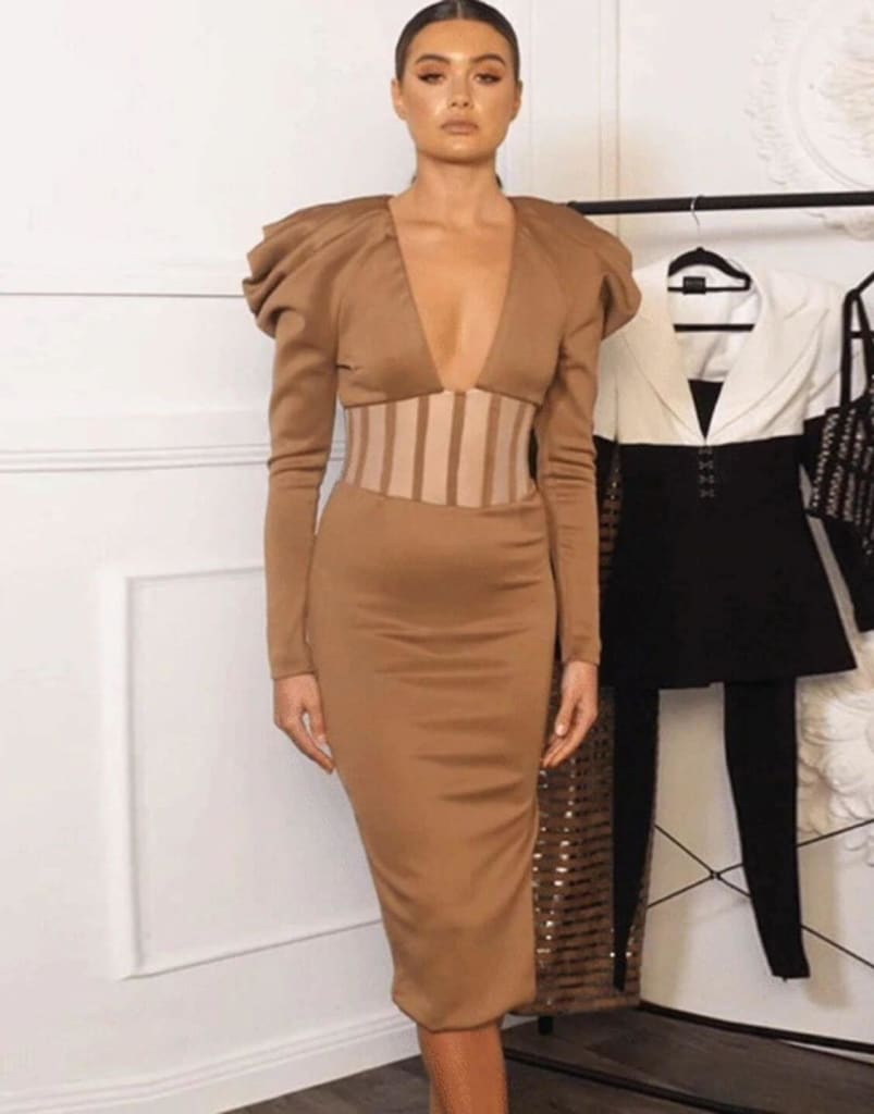Confidence is always in style, and this dress is sure to boost your self-assurance with its flattering v-neck and elegant long puff sleeves. You’re bound to turn heads and inspire others with your bold fashion choices.