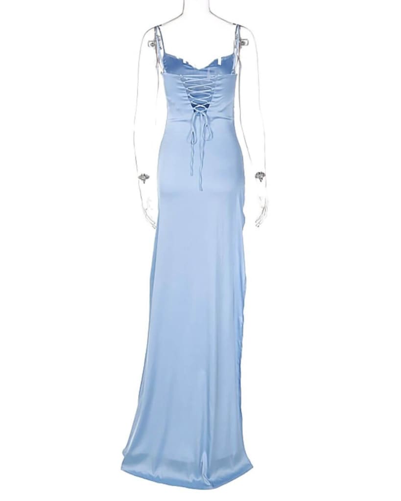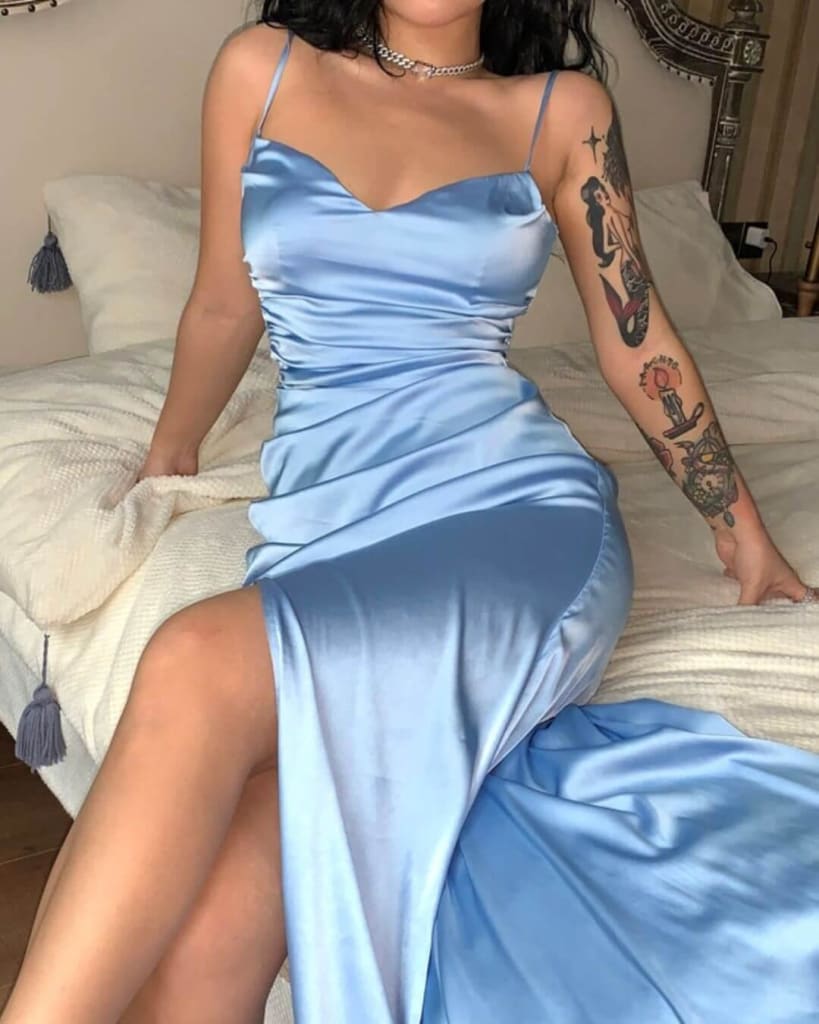Step out in style with our elegant satin strap side slit ruched bodycon dress. Perfect to wear to your next event. Show off your unique sense of style and wow everyone in the room. With its sleek and sophisticated silhouette, you’ll make a statement from day to night.