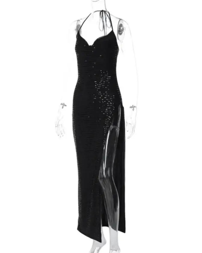 Made with stretchy fabric, this dress is comfortable to wear, while the sequined detailing adds a touch of sparkle that is perfect for any party or evening occasion. Whether you’re attending a cocktail party or prom, the Elegant Sequined Halter Slit Split Dress has got you covered. Its versatility makes it perfect for any occasion, and its unique style is sure to turn heads wherever you go.