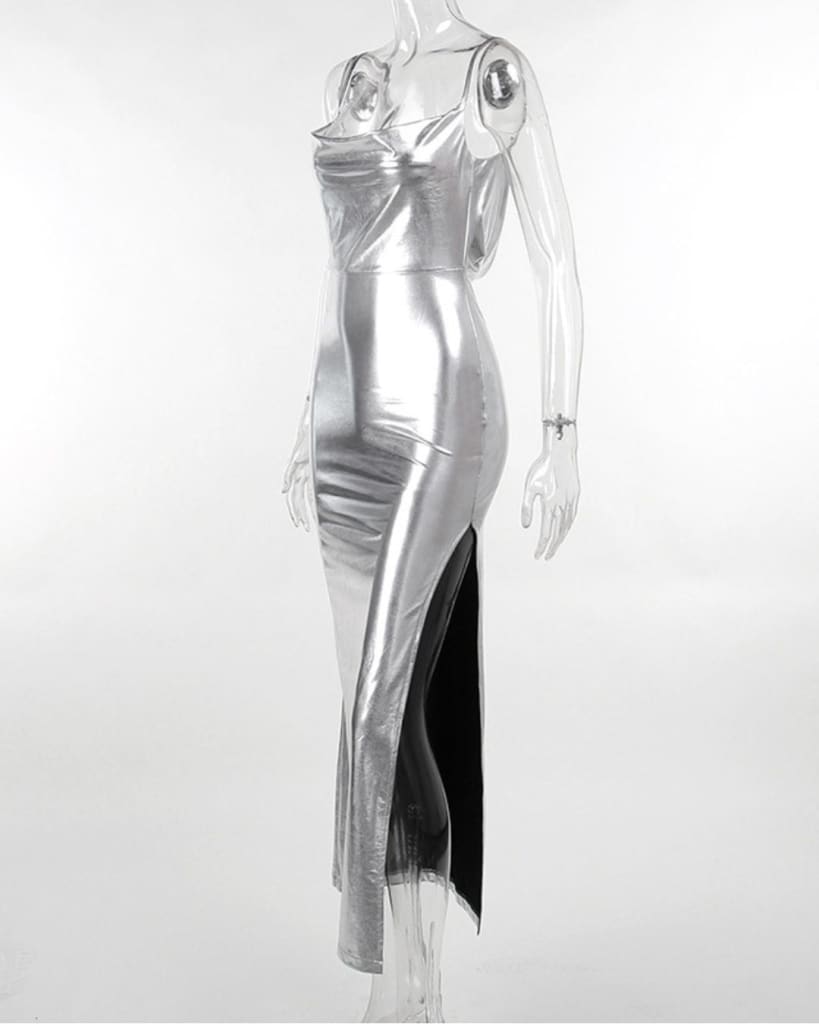 Look and feel like royalty in this stunning maxi dress. Featuring side slit and backless design, this elegant dress is perfect for any special occasion thanks to its shiny fabric. Make a bold fashion statement with this beautiful piece.