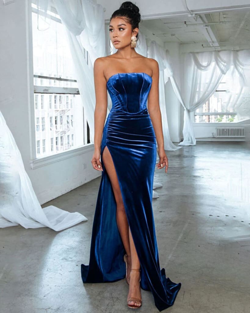 Fall in love with our elegant strapless evening corset side split maxi dress for a look that tells your story.