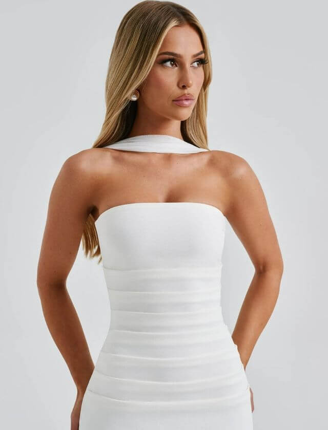 Make an unforgettable entrance with our Elegant Strapless Zipper Bodycon Dress With Gloves — a striking fusion of sophistication and seduction. This form-fitting dress features a sleek strapless neckline, figure-hugging silhouette, and a bold back zipper for a modern edge. The matching gloves add a touch of high-fashion drama, perfect for galas, cocktail events, or upscale evenings.