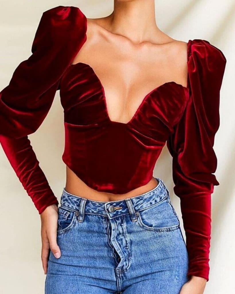 Bring on the standout style with our unique v-neck long sleeve fashion velvet crop top. Available in Red, and Black. Perfect to wear during the day or in the evening! Transform your wardrobe with our fierce v-neck velvet crop top. Stand out in bold colors like Red and Black. Take on any occasion – day or night – with confidence!