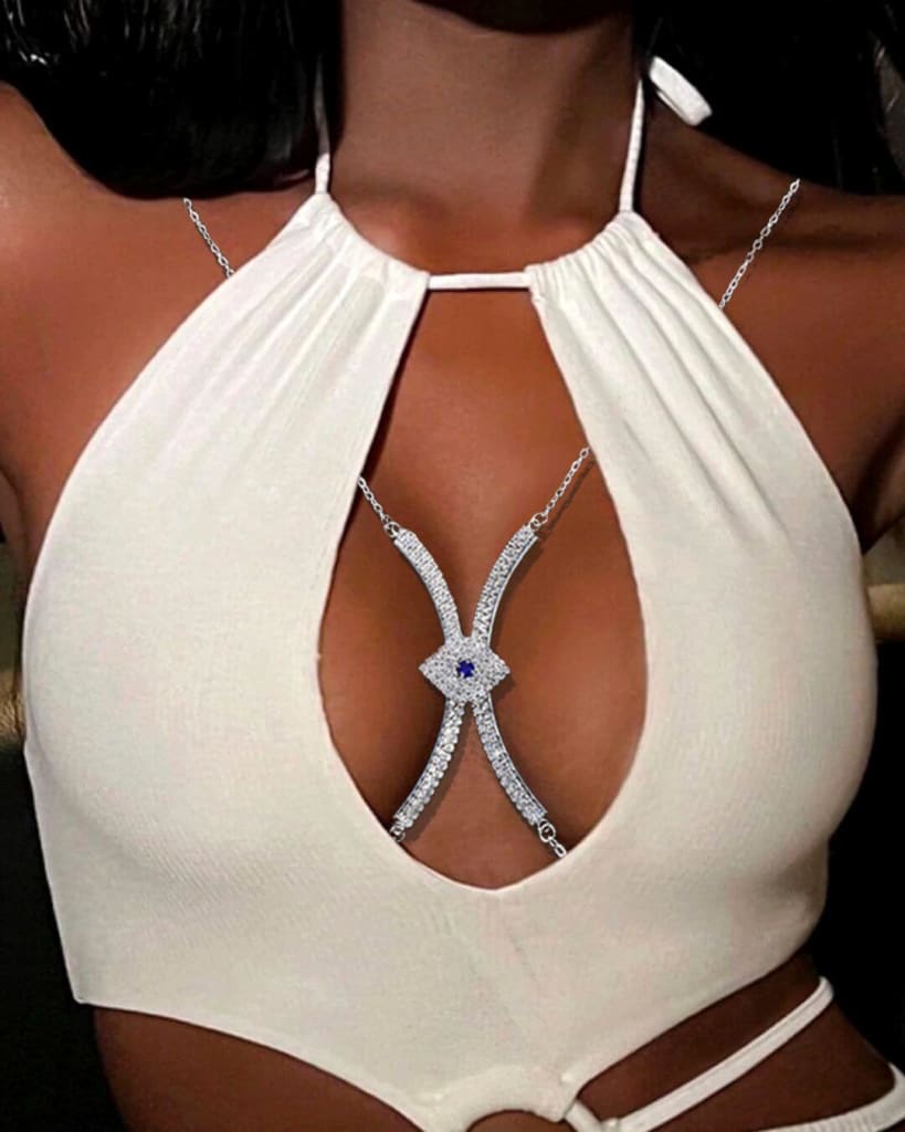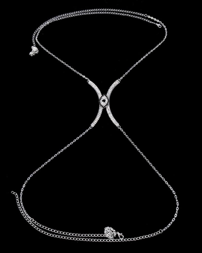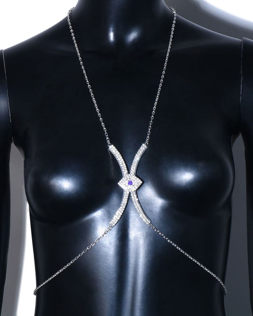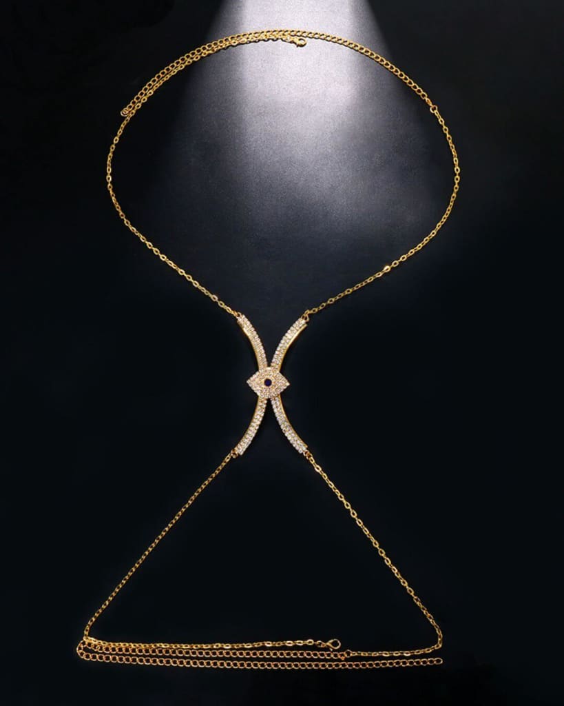 Show off your bold style with this sparkling Evil Eye Chest Bracket Bra Chain Necklace Body Chain. Its unique design will bring eye-catching appeal to any outfit and add a touch of subtle glamour. With rhinestone accents and the unique body chain design, you’ll be sure to make a statement.