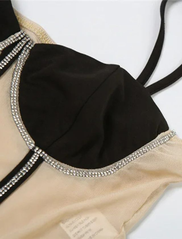 Featuring a figure-hugging bodycon fit, this jumpsuit is designed to accentuate your curves and boost your confidence. The corset detailing adds a touch of glam, while the V-neck and spaghetti straps offer a flirty and feminine touch. The mesh and rhinestone embellishments create an eye-catching and unforgettable look, making you the center of attention wherever you go.