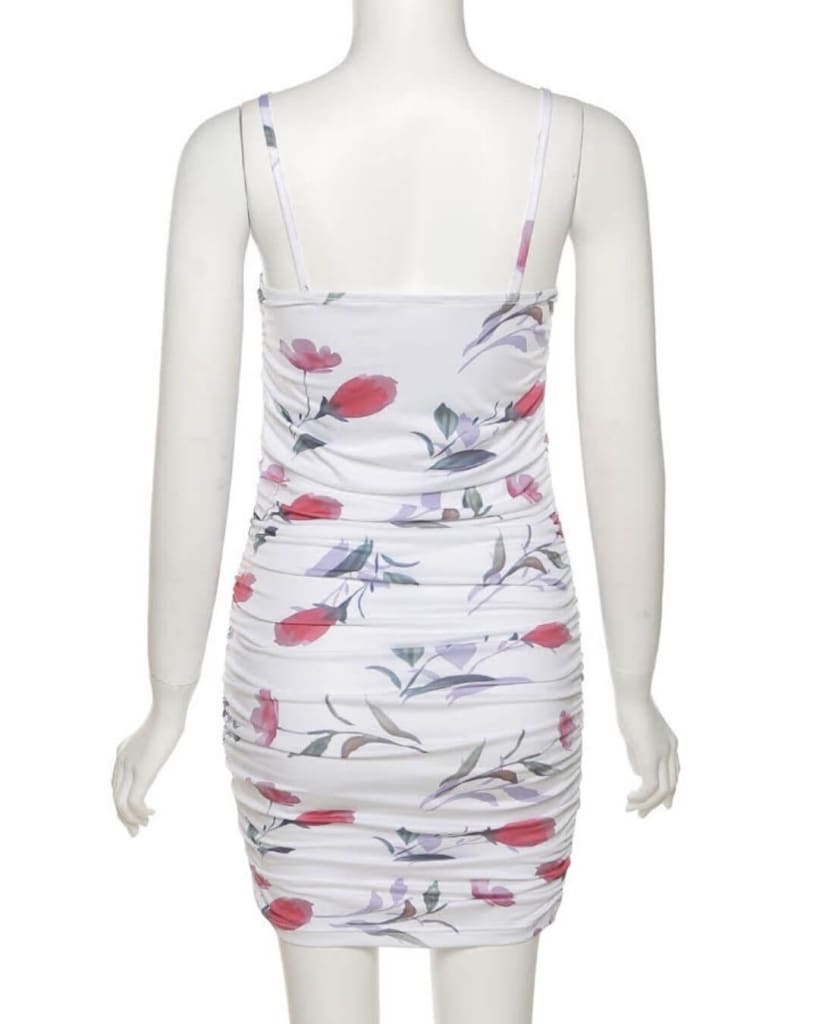 Elevate your style with our floral print spaghetti strap mini dress that fits every occasion. Featuring a unique cut, floral print, and stretchy material.