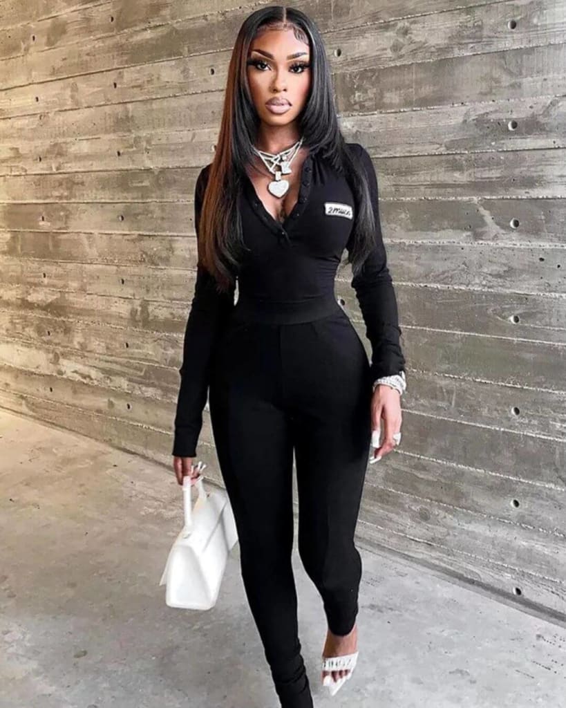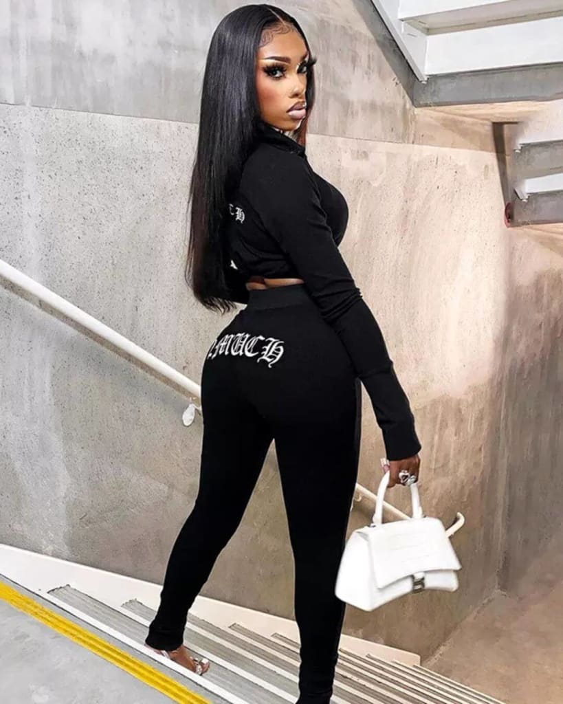 Stand out from the crowd in our elegant 2 much fashion letter print long sleeve casual crop top and pant body-con outfit set.