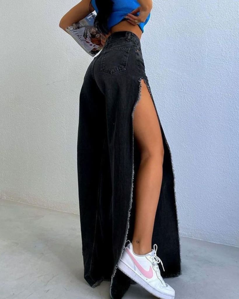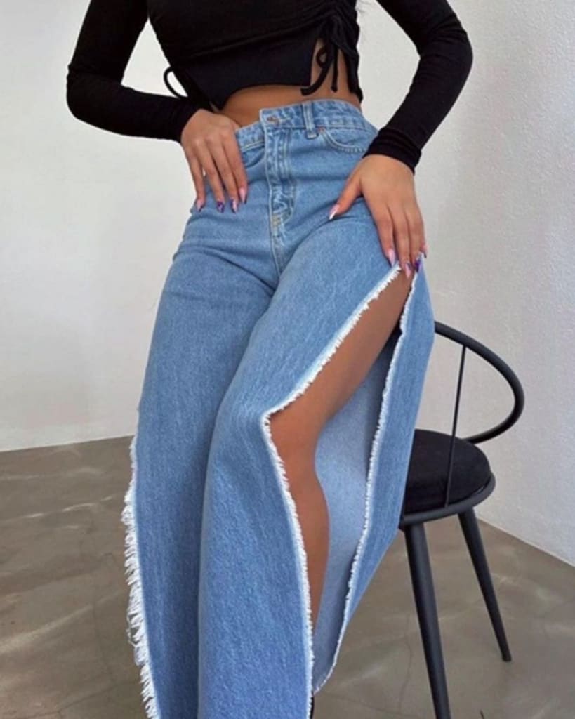 Elevate your style with these sleek Fashion Split High Waist Straight Jeans. Crafted from a blend of quality cotton and spandex, the jeans offer a comfortable and flattering fit. The high waist design adds an extra level of sophistication, while the split hem adds a fashionable flair. Perfect for any occasion.