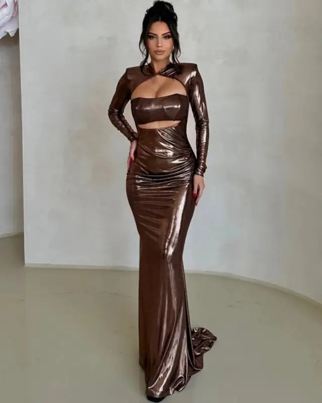 Experience the perfect blend of edgy and elegance with our Faux Leather O-Neck Hollow Out Long Sleeve Maxi Dress. Made with high-quality faux leather, this dress features a chic O-neckline and intricate hollow-out detailing, adding a touch of sophistication and sexiness to any occasion. Make a statement and turn heads with this stunning dress!