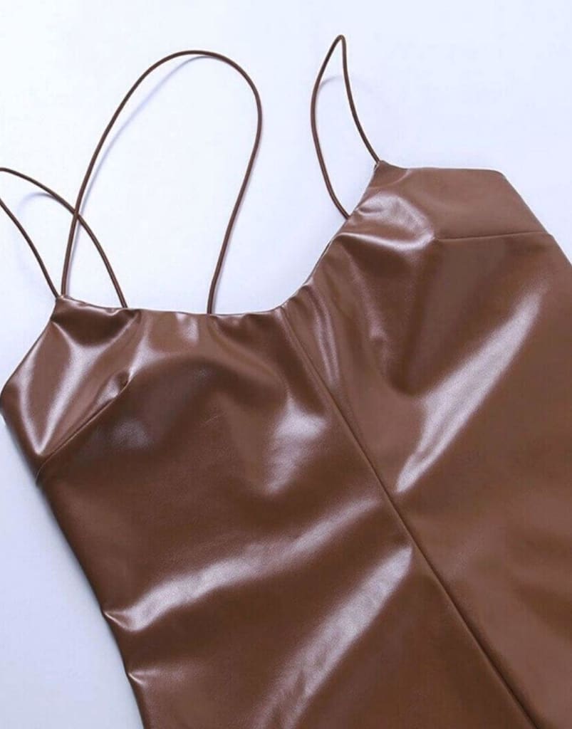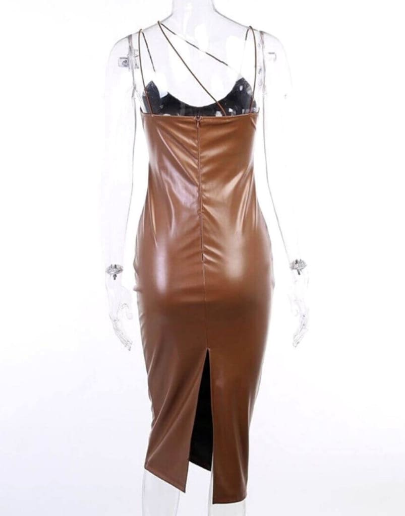 Flaunt this evening PU faux leather split stylish and trendy brown maxi dress for upcoming events and look effortlessly stylish wherever you go. Ideal for winter season. Get ready to turn heads and make a statement with this stunning evening dress. Its faux leather material gives it a touch of edginess, while the split design adds a hint of playfulness. With a trendy brown color, this dress is perfect for any upcoming events and will keep you looking effortlessly stylish no matter where you go. And with its warm and cozy fit, it’s the ideal choice for the winter season. Show off your sense of style in this must-have dress!
