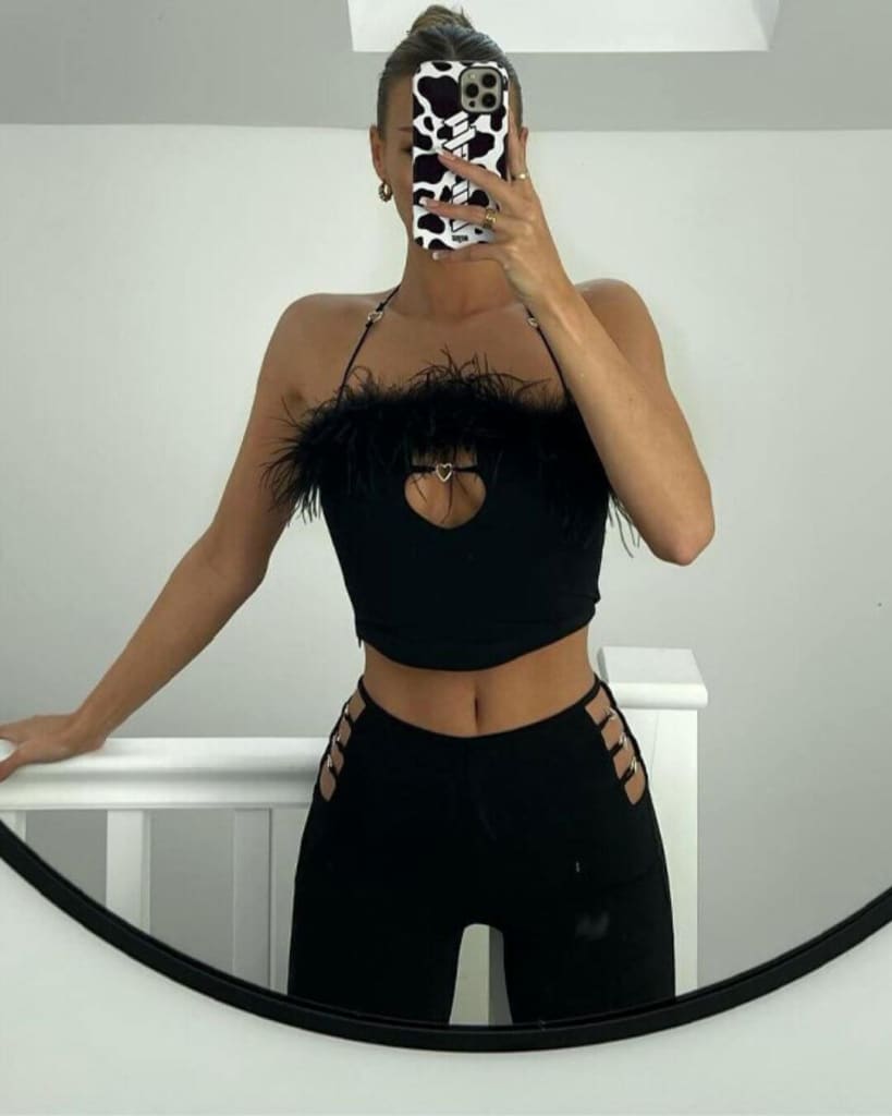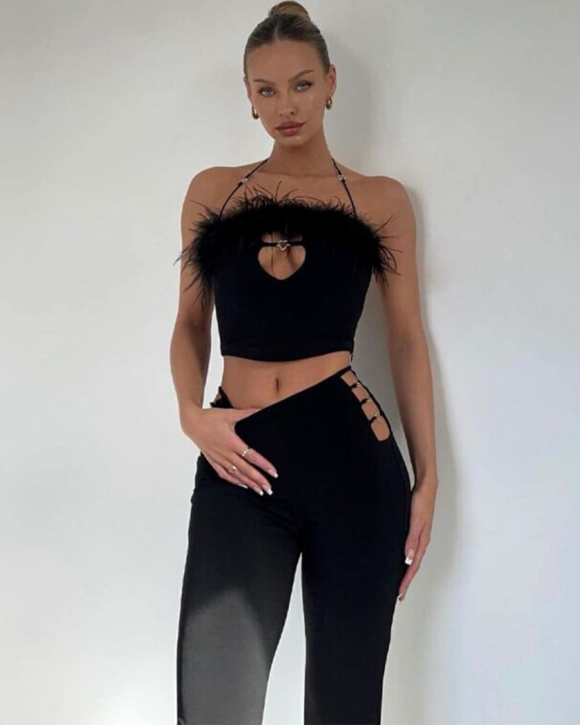 With a stunning feather hollow out crop top and wide-leg pants, this set is all about showing off your curves and embracing your inner fashion icon. The bodycon fit and V-neck detail add a touch of sultry sophistication, while the stretch fabric ensures a comfortable and flattering fit for all shapes and sizes.
