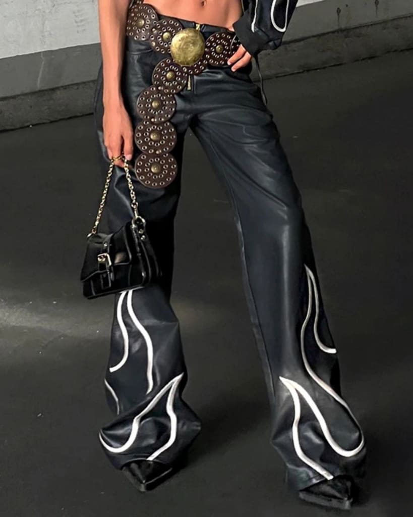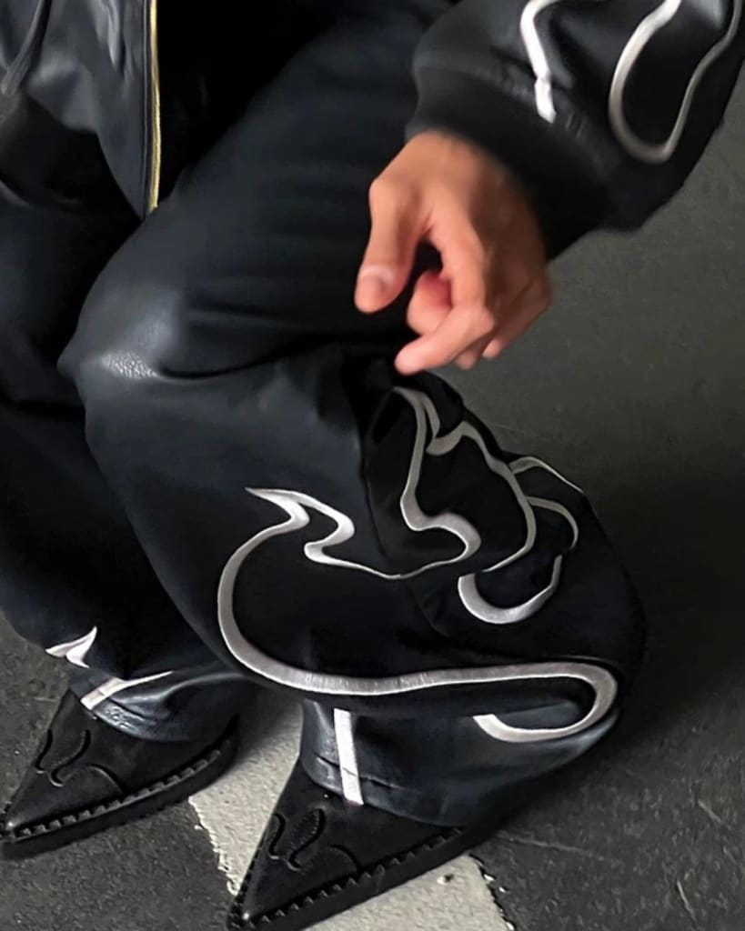 Get ready to shine brighter with the Flame Embroidery Goth Punk Flare Leather Pants from STYLORD Boutique!