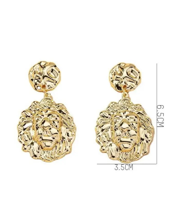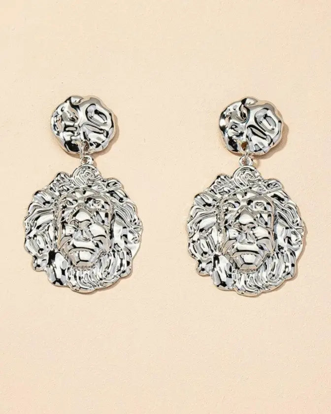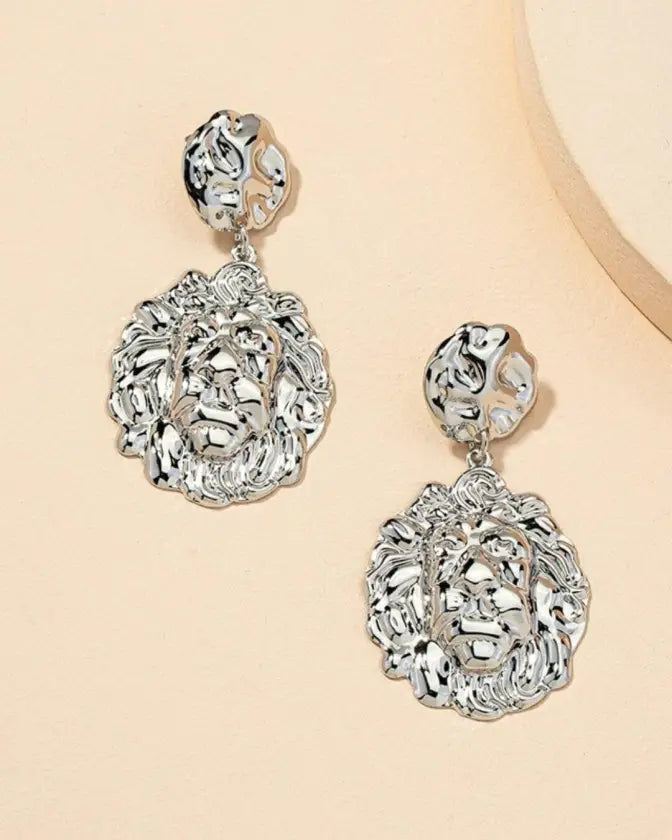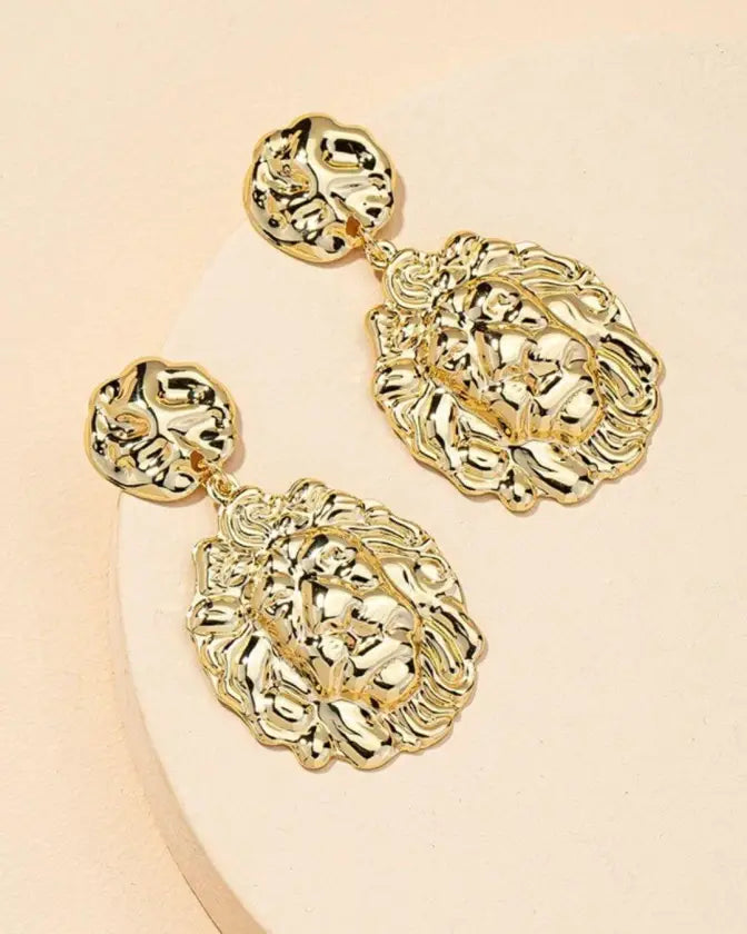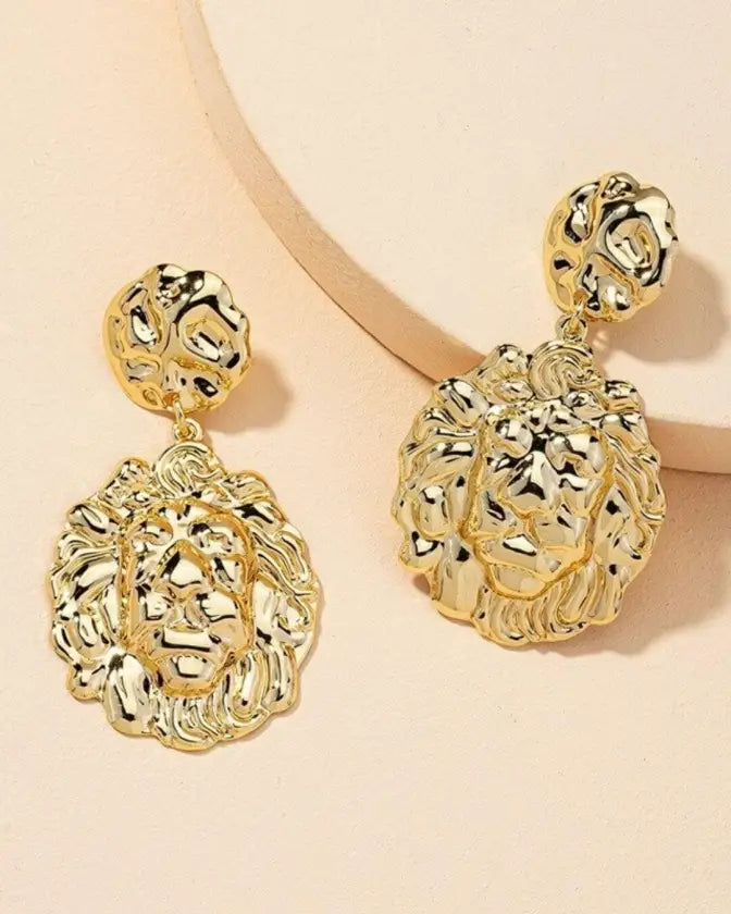 Exquisite elegance comes in abundance when you accessorize your look with a pair of geometric lion head dangle earrings.