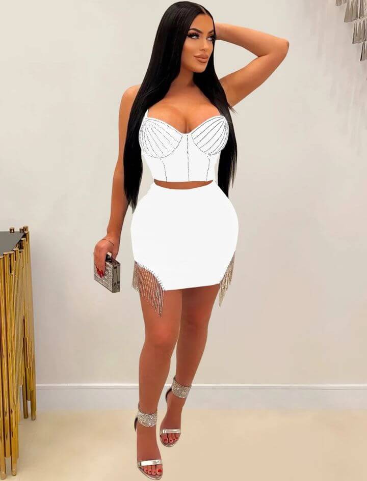 Step into the spotlight with our Glitter Diamonds Crystal Skirt Two Piece Set, designed for women who love to shine. This glamorous set features a sparkling crystal-embellished top paired with a matching glitter skirt, creating a dazzling look that captures attention from every angle. The fitted silhouette enhances your curves while delivering high-impact glamour.
