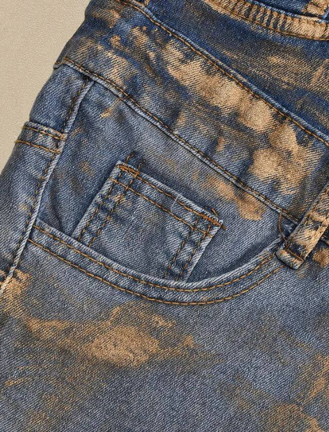 The stunning gold stamping adds a touch of glamour to this classic denim mini skirt, making it a versatile piece that can be dressed up or down for any occasion.