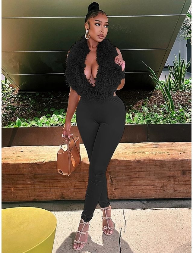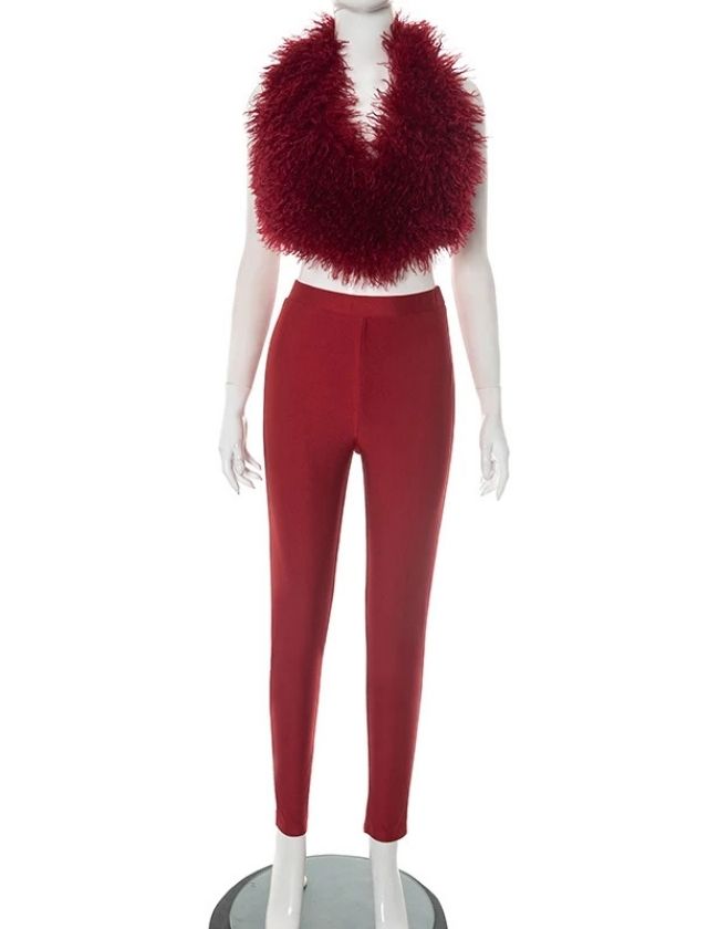 Make a bold fashion statement with the Halter Backless Fur Tank Top + Legging Two-Piece Set. Featuring a stylish halter neckline and daring backless design, the fur-accented tank top adds a touch of glamour and texture. Paired with sleek, figure-hugging leggings, this set creates a flattering silhouette that blends comfort with standout style.