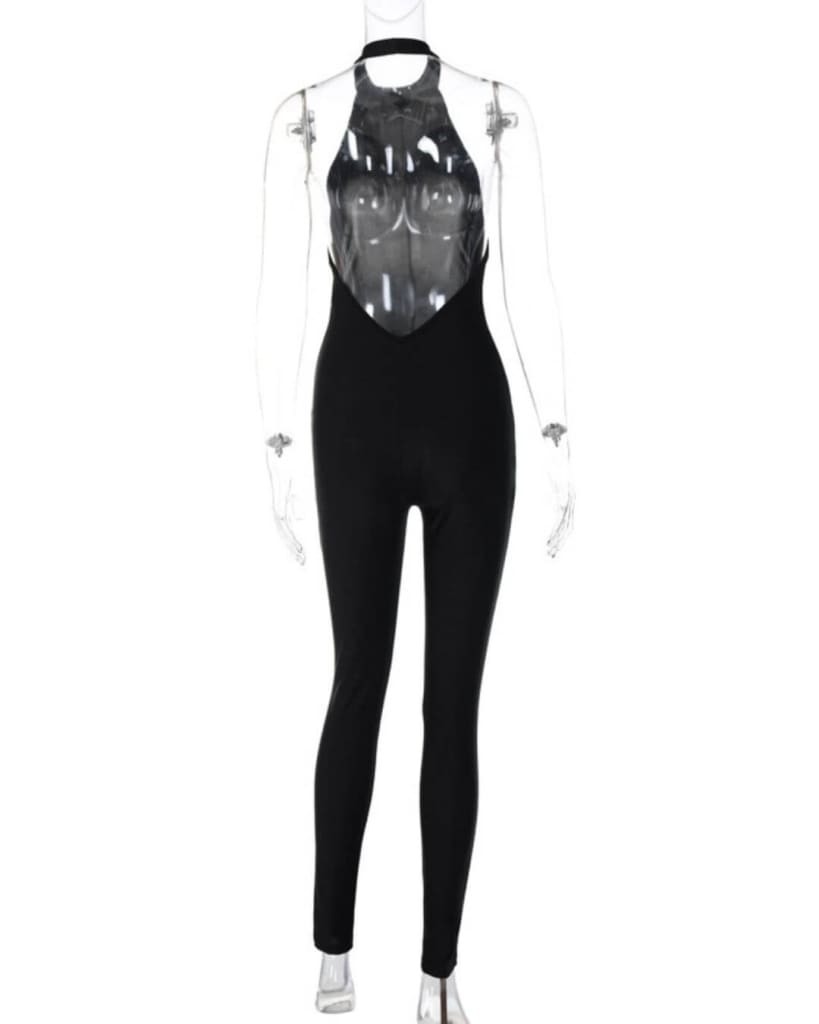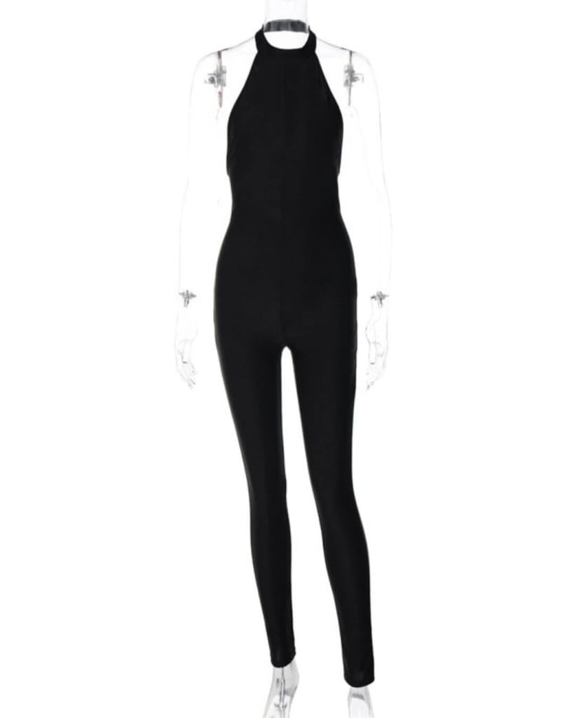Make a style statement with ultra-chic and sexy halter sleeveless backless body-con o-neck sexy jumpsuit. All in one that go from daytime to dinner.