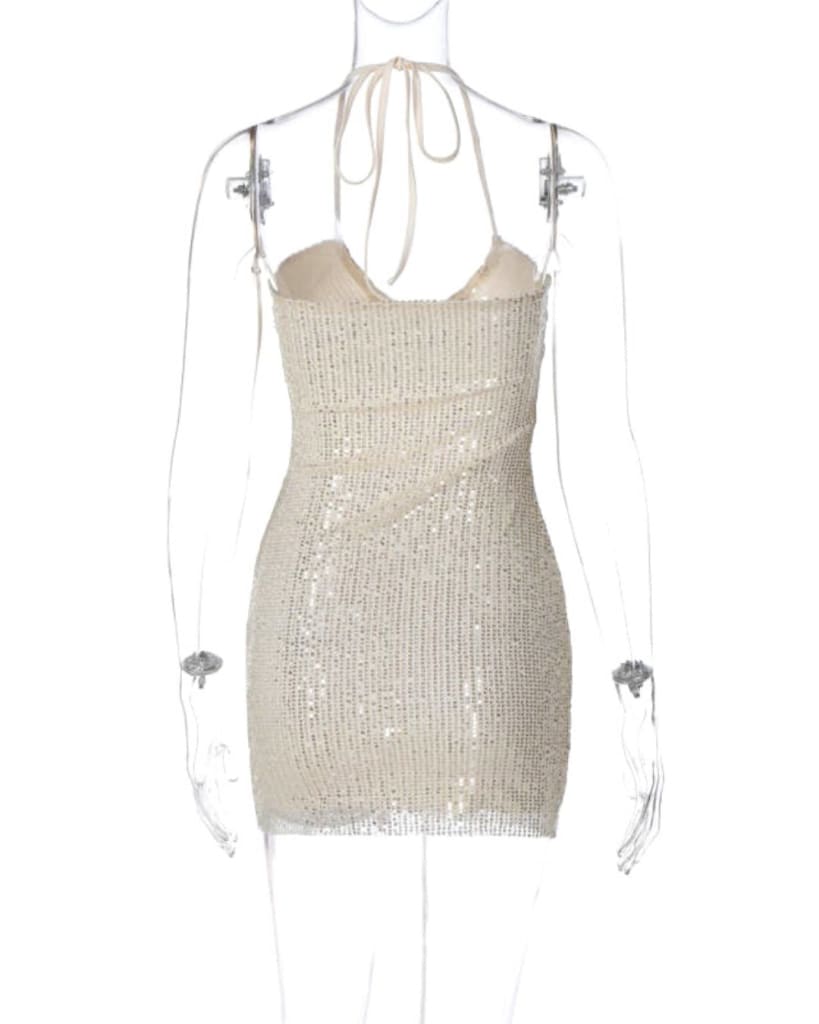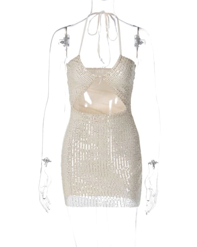 Turn heads in this Halter Solid Hollow Out Glitter Sequin Mini Dress! With a sparkling sequin fabric and eye-catching halter design, this dress will ensure all eyes will be on you! Feel beautiful and captivating – be the star of the show!