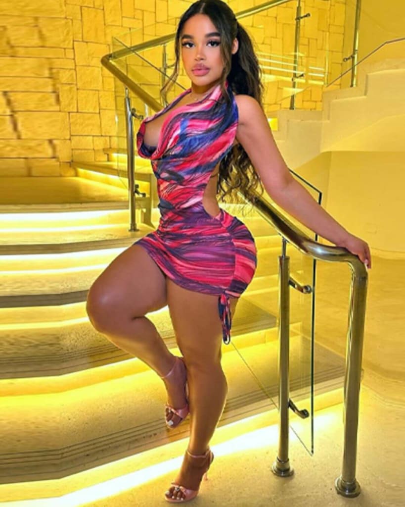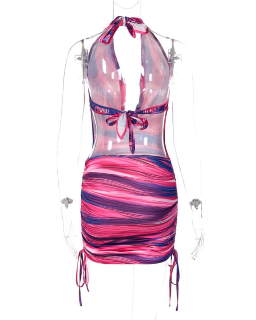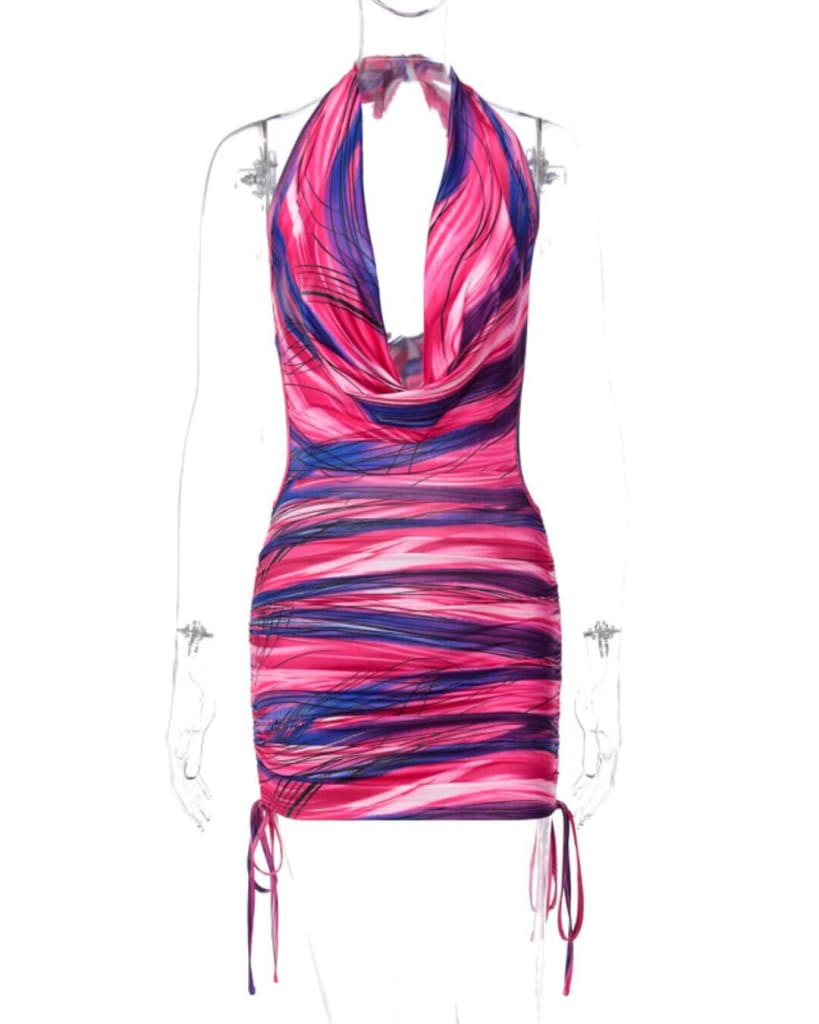Experience a burst of artistic style with this halter tie dye backless ruched mini dress, perfect for any occasion. Crafted with exquisite design, this dress features an alluring halter neckline, a backless silhouette that flatters the figure, and a gorgeous tie dye pattern that will make you stand out in any room. Enjoy a chic, sophisticated look with this luxurious dress.