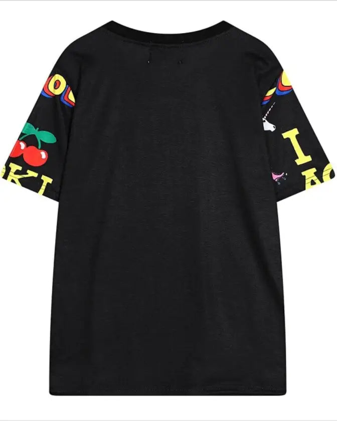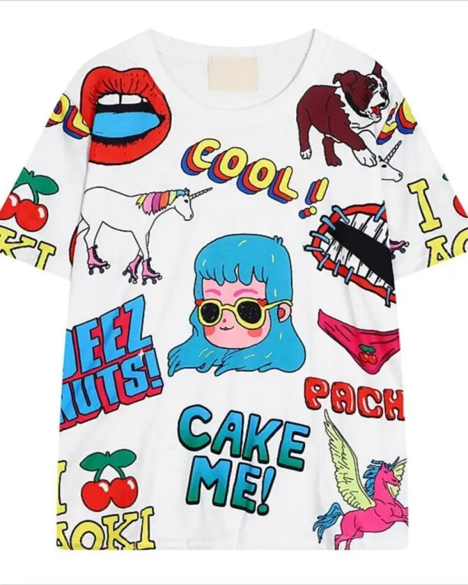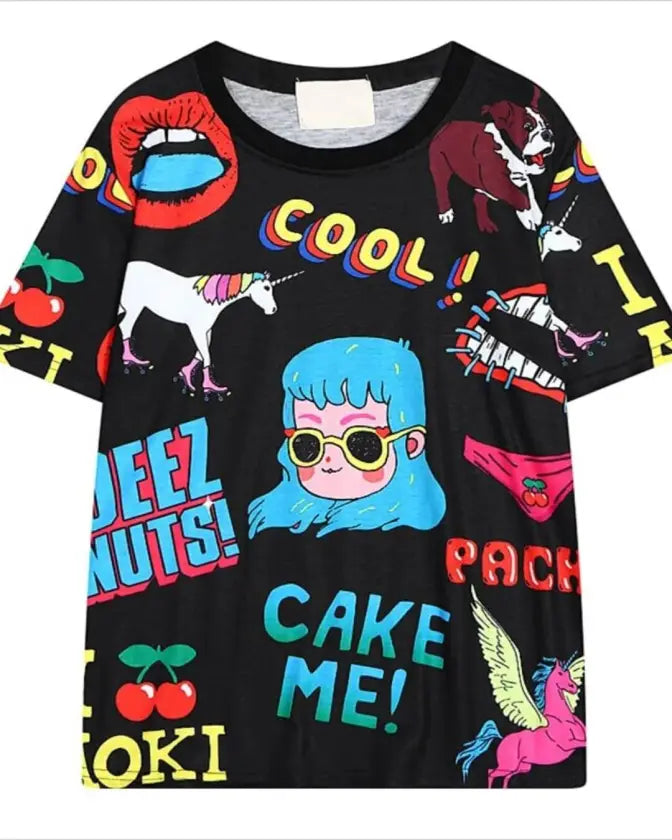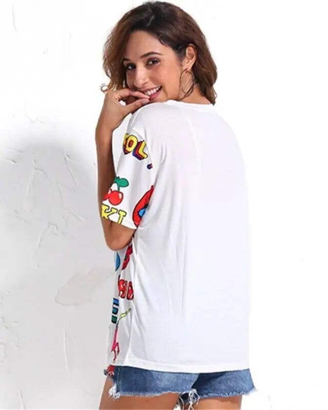 Funk up your style with our fashionable selection of loose cartoon print t-shirt. Available in black and white color.