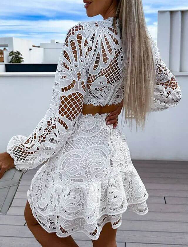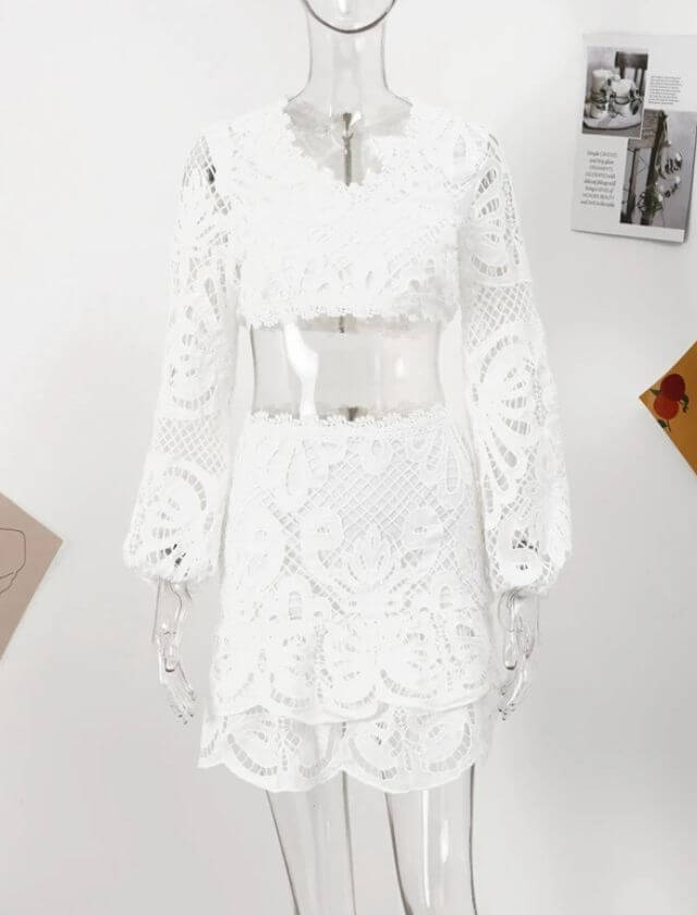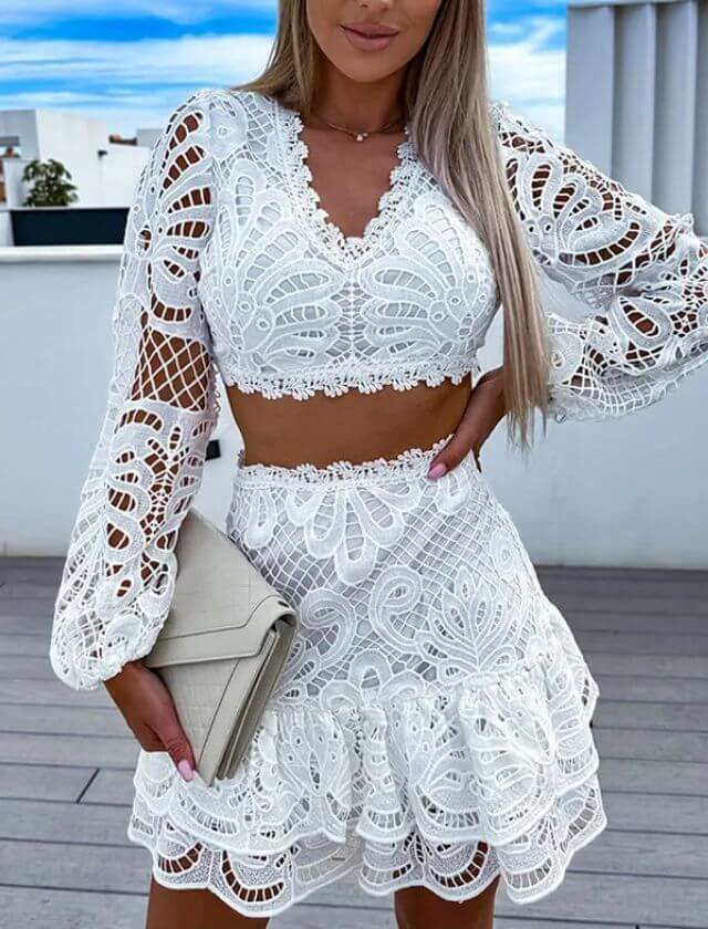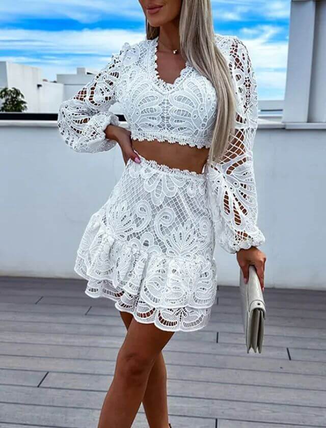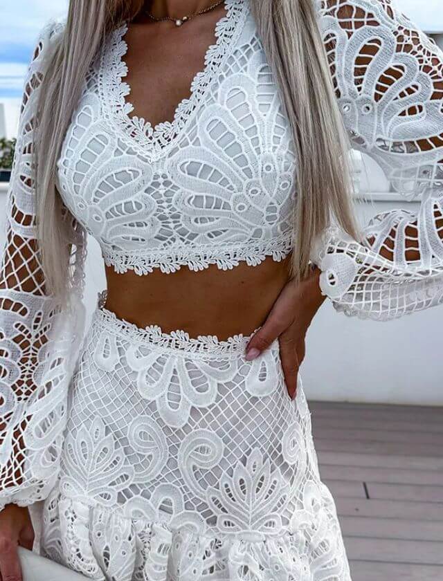 With its intricate hollow-out embroidery and trendy puff sleeves, this set will have you feeling confident and oh-so stylish. You’ll be turning heads and setting trends wherever you go!