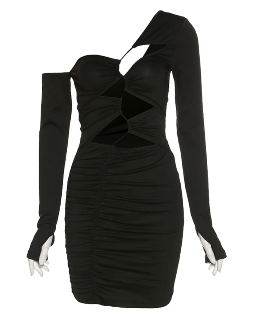 Hollow Out Solid Asymmetric Long Sleeve Club Dress