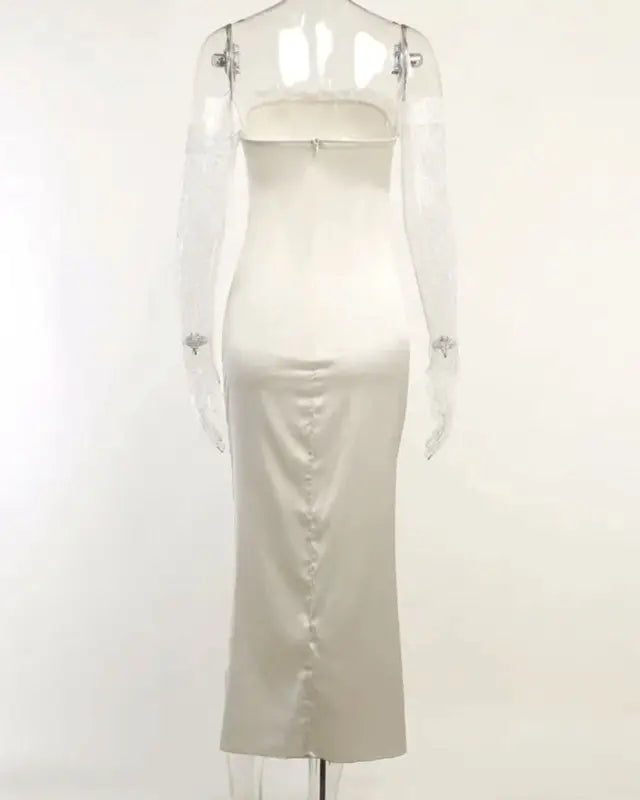 Crafted with a delicate lace bodice, this sophisticated evening dress is perfect for any formal event. Its off-the-shoulder design gives it an elegant touch, while the satin fabric creates a luxurious, glamorous feel. Make a statement in this timeless piece.