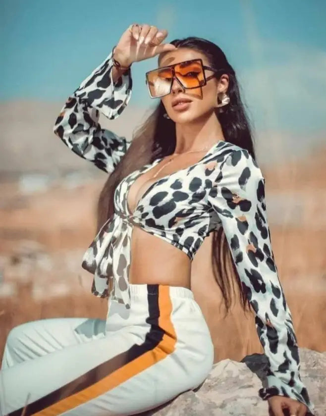Make a style statement with ultra-chic long sleeve animal print crop top. Perfect to wear during the day or in the evening.