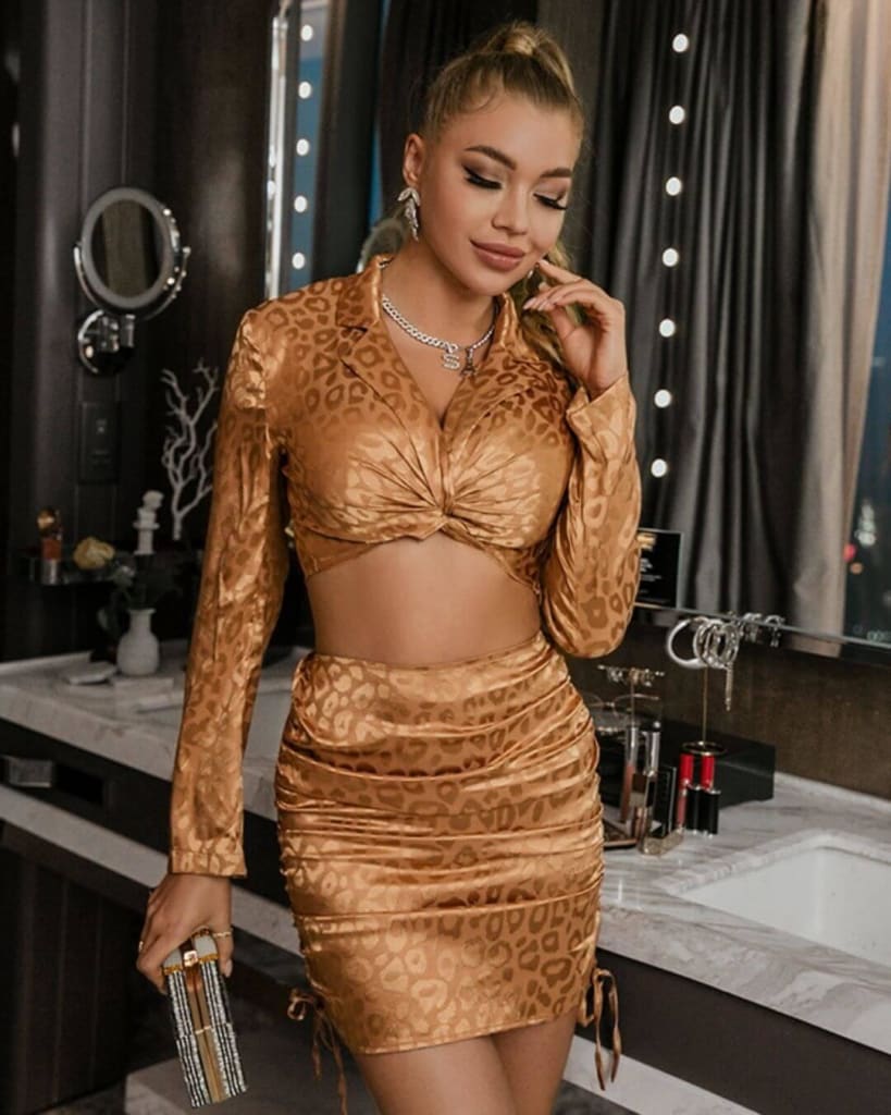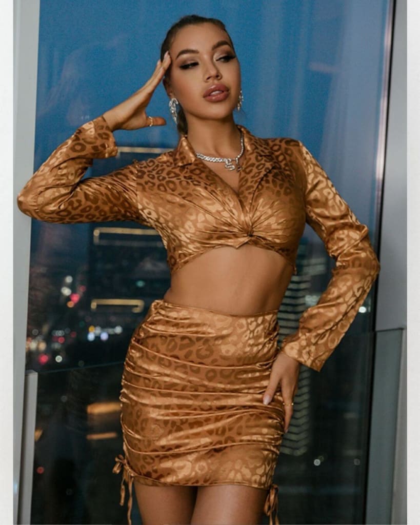 This is your time to shine with this elegant leopard print sexy two piece set perfect for any occasion. It offers unrivalled versatility and sheer elegance.