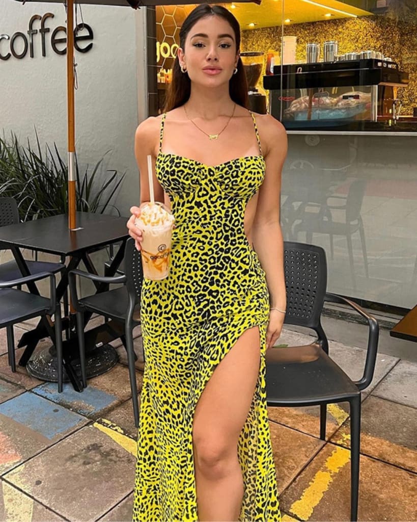 Step into the spotlight with our Leopard Slit Spaghetti Elegant Party Backless Dress! This striking dress is perfect for the adventurous and confident fashionista who isn’t afraid to make a statement. The leopard print design will ensure you stand out from the crowd, while the backless and spaghetti strap details add a touch of allure and sophistication to your look.