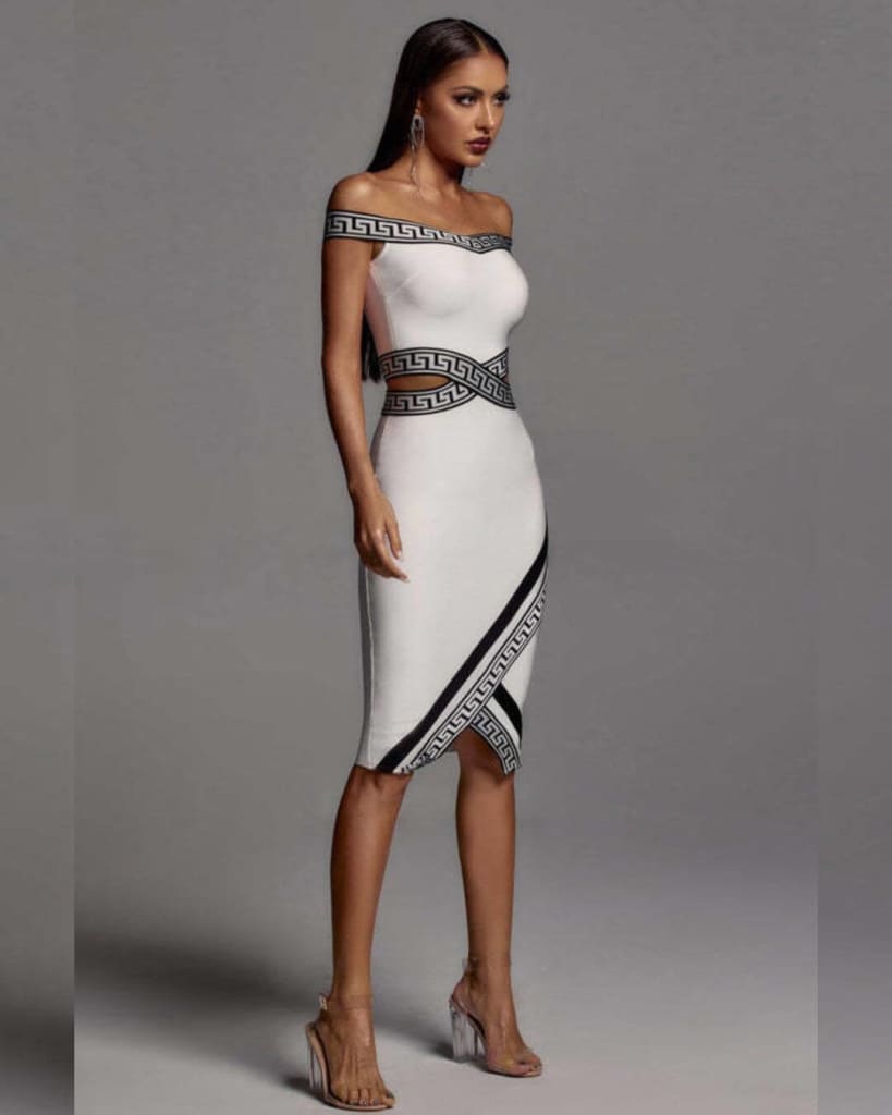 The Luxury Off Shoulder Bandage Midi Dress offers an elegant look, with a midi length and off shoulder design. A bodycon fit provides the perfect contour for a stylish and exquisite look. This dress is made of premium materials, perfect for a chic occasion outfit.
