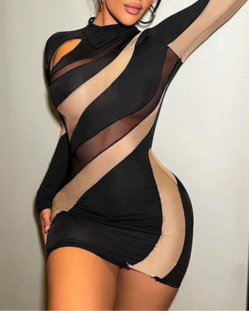 Take a risk and show off your style with this mesh thin long sleeve double color spliced mini dress. Let your look shine with the intricate spliced in colors that will turn heads and leave you feeling confident and daring. Embrace the challenge and express yourself!