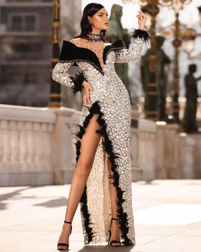 Make an unforgettable entrance in the New Fashion Chic Feather Sequin Designer Evening Dress, where high-fashion glamour meets bold sophistication. Designed with shimmering sequins and delicate feather accents, this dress delivers a luxurious statement look inspired by runway and celebrity style. Its elegant silhouette enhances your figure while reflecting light beautifully with every move.