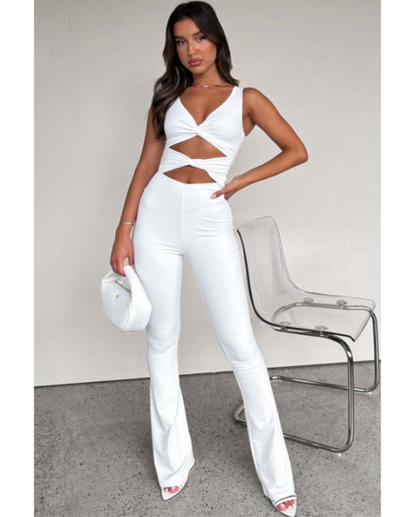 This waist-cinching New Hollow Knot Cut Out Sleeveless Jumpsuit is the perfect party piece. Featuring a v-neck and stretch fabric, ideal for the summer months, it is sure to become one of your favourite go-to looks for a sexy and stylish look.