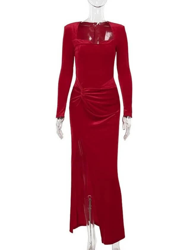 The luxurious velvet fabric adds a touch of opulence, while the bodycon fit and V-neck design create a flattering silhouette. The long sleeves and ruched detailing add a modern twist to this timeless evening gown, making it a standout piece in your winter wardrobe.